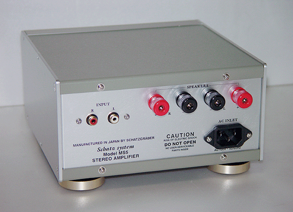 MSシリーズの最上位機種 MS1の上位機としてラインナップされたアンプです。 音の傾向は、MS1の延長線上に位置し、音の純度・再現性を追及したアンプです。 MS1との 回路的な大きな違いは左右両チャンネルに独立した電源供給を 持っているということです。 MS1は左右共通の電源部を利用しています。 左右19W+19Wの定格出力は変わりません。その他MS5では音響的な 純度を増す方向での措置が全体にすすめられています。 外観は高さがMS1の2倍の大きさになっています。 幅と奥行きは変わりません。 スピーカーターミナルは左右4端子が独立したねじ式のターミナルが使われています。 これはバナナプラグ も利用可能です。 電源部はACインレットが設けられ、 電源ケーブルの差し替えが可能です。